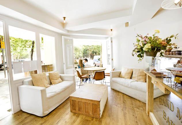 INTERIOR: designed by Manex Susaeta, light drenched corner location with shared tables and sofas inside as well as external terrace seating on the chaflán corner of the semi-pedestrianised Enric Grandos street.