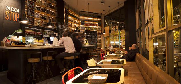 INTERIOR: designed by Pilar Líbano, warm and intimate. Huge window overlooking the street connects outside and inside introducing natural daylight throughout the day. HIGHLIGHT: continual kitchen service. Wifi. OFFRERING: Organic meat hamburgers, variety of tasty salads, sandwiches, wraps and other dishes available any time of day. Javier Álvarez is the chef who oversees the food. Midday lunch during the week includes a fish or meat main course, priced at 9.50 Eur. including drink, dessert and coffee. The Fígaro “Afterwork” happy-hour (from 7PM to 9PM); a cocktail or premium gin for 5 Eur. Exquisite cocktails served till 3AM including all time classics , modern and in house speciality cocktails. RECOMMENDED: the ecological hamburgers with or without the bun. The Eggs Benedict, the Chicken Curry or the Veal Tártar, served with strips of toasted bread. The Lemon Pie, a standout on the dessert menu. PRICE: 15 Eur.