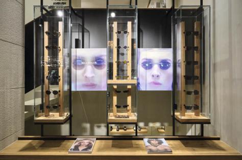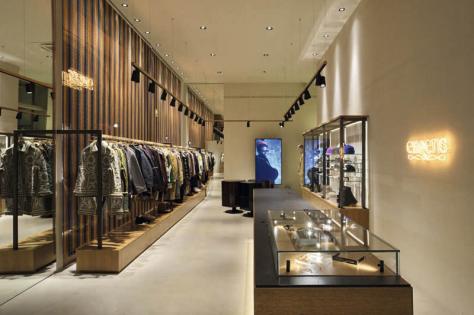 Other fascinating elements include the glass display tables with their exposed extendable mechanisms, or a peculiar cabinet that serves as a bar counter. The materials include timber, iron, laser-sealed optical glass display cases and frosted-striated glass on the fitting room doors. The mirrors at the ends of the rooms add depth, and the ivory microcement flooring confers spaciousness.