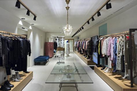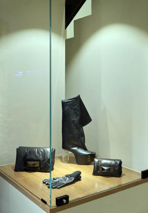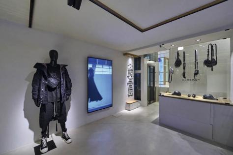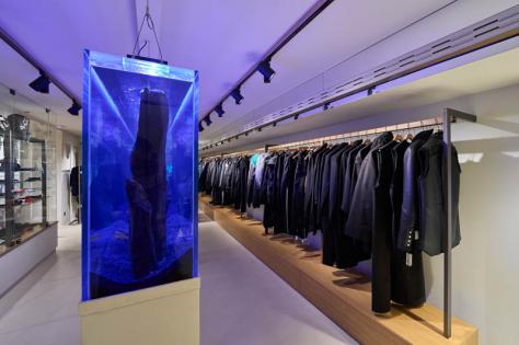 in the basement, there’s a stylised minimalist design elongated aquarium at the centre, with a range of men’s clothes especially featuring the black avantgarde trend, including pieces by Rick Owens, with some unisex designs, Alyx, Raf Simons, the Danish designer Heliot Emil, the Korean brand Juun.J, Innerraum and Werkstatt:München.