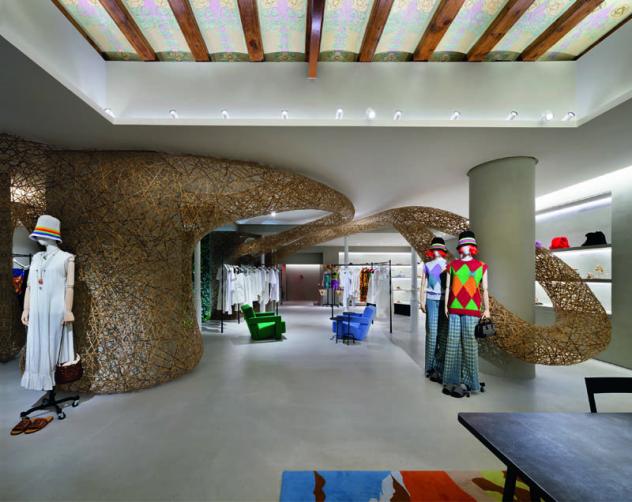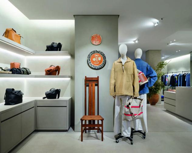 El interior está organizado no solo según la exposición de los productos, sino también de una serie de obras e intervenciones artísticas. El concepto central de CASA LOEWE es la presentación de obras de la colección LOEWE, una antología creciente de arte, artesanía y diseño; cada pieza ha sido seleccionada según principios de excelencia, innovación y artesanía. En el entresuelo se encuentra una escultura site-specific a gran escala construida en bambú del artista japonés Tanabe Chikuunsai IV; esta delicada estructura se extiende a ambos lados del espacio en curvas sinuosas como si se tratara de un organismo vivo. De manera similar, una escultura en macramé suspendida de la artista catalana Aurelia Muñoz se encuentra en una esquina revestida en cerámica azul mediterráneo en la planta de abajo. Sobre la escalera cuelga Dangling Hairy Hug de Haegue Yang, una dramática pieza escultórica negra, junto a la ventana de Richard Wright. Intercalados dentro de la tienda hay ocho cerámicas de Pablo Picasso seleccionadas por Anderson.