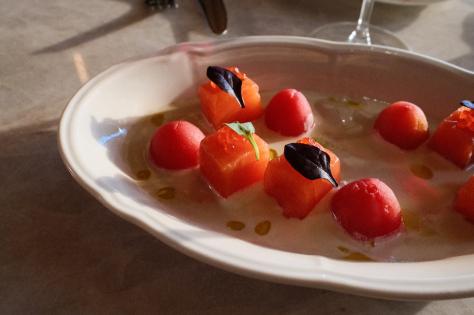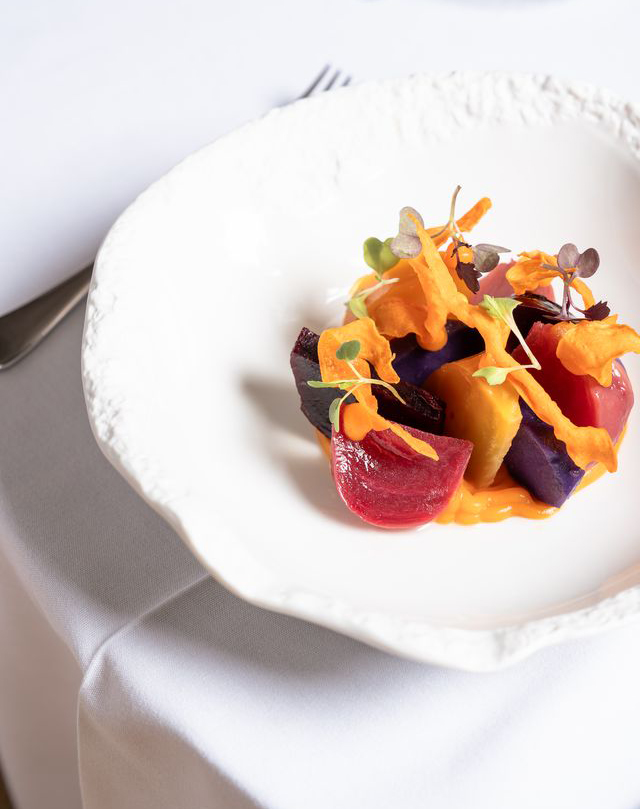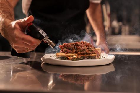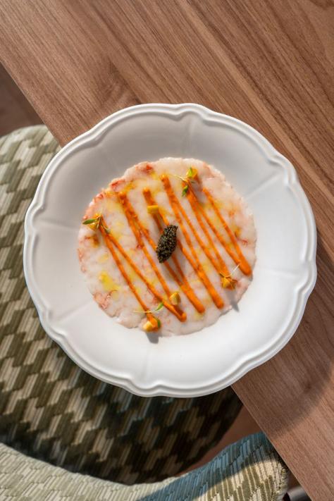 Allí, el chef Rubén Briones trabaja con productos de proximidad y temporada, desde la sencillez y la sinceridad. Probamos la Ensalada de raíces con chips de boniato y aderezo de sherry y remolacha, el Carpaccio de cigala con su mayonesa y caviar, el Steak tartare de ternera cortado a mano con tuétano asado, la Lubina salvaje con sofrito y salsa de puerro y perejil, la Chuleta de cerdo servida con puré de manzana, y el Flan de chocolate con pan crujiente, aceite de oliva y helado de leche ahumada.