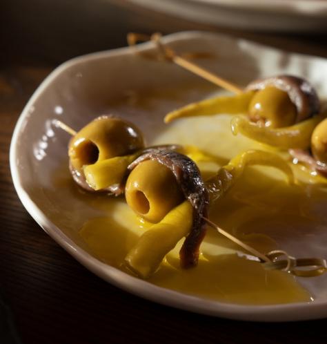 Pedimos unas gildas, una ración de salmón curado con ajo blanco y unas croquetas de jamón ibérico, que acompañamos con vermut de Tarragona y el pisco sour de la imagen. Entre los enunciados encontramos patatas bravas y embutidos catalanes, una escalivada y un guiso de bacalao con garbanzos, un pepito de ternera y un frankfurt de txistorra.