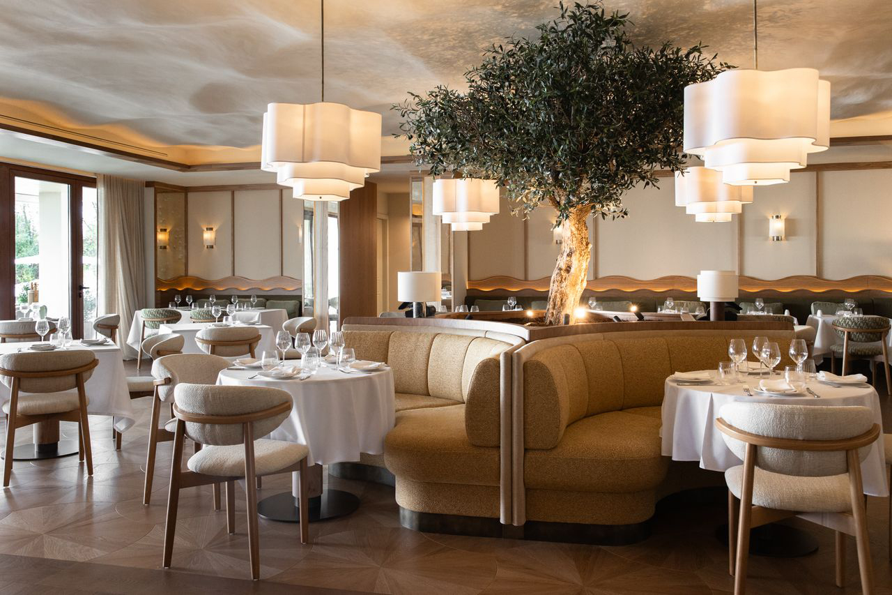 Astet Studio firma el diseño interior de una sala luminosa con un olivo en el centro, integrando materiales naturales y una paleta cromática que evoca el paisaje catalán y genera una atmósfera serena.